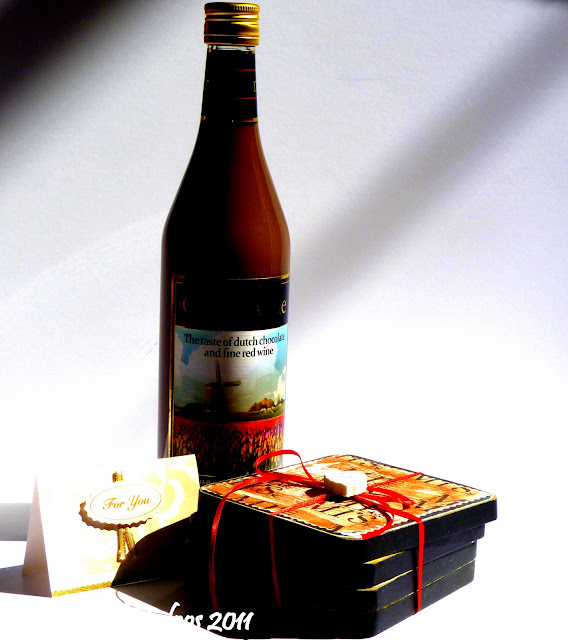 Do not disturb sign, chocolate, mini wine bottles, some heart tea towels, chocolate fortune cookies...